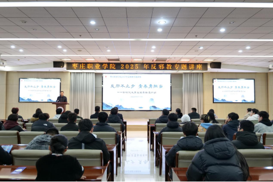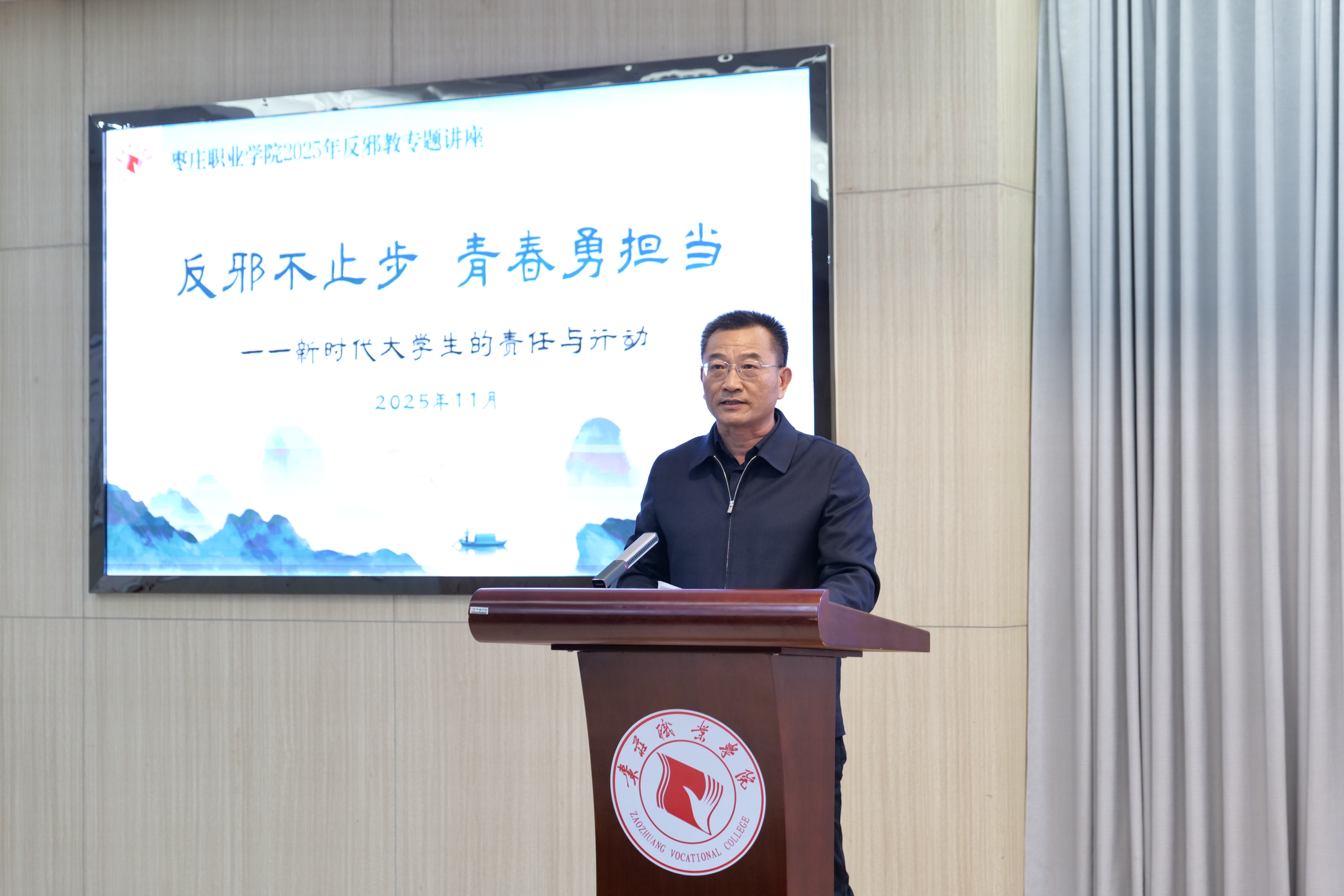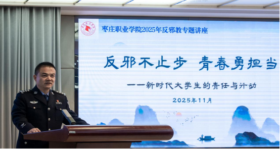 为筑牢校园反邪教思想防线,引导青年学生认清邪教本质、远离邪教侵害,切实增强新时代大学生法治意识与责任担当,11月19日,学校在学术报告厅开展“反邪不止步 青春勇担当——新时代大学生的责任与行动”主题教育活动。学院党委副书记张华伟出席并主持活动,薛城公安分局民警张锋、高新区公安分局民警张丹婕受邀出席,安保处负责同志以及全校160余名学生干部代表参加此次活动。