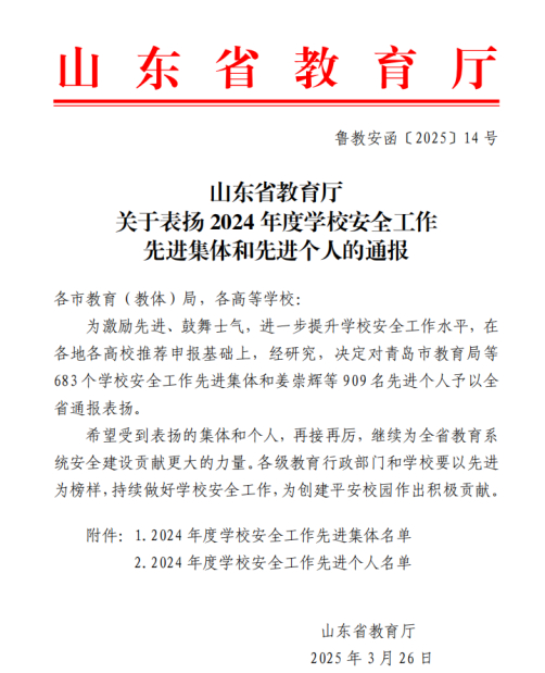 3月26日,山东省教育厅下发了《关于表扬2024年度学校安全工作先进集体和先进个人的通报》,学院被省教育厅评为2024年度学校安全工作先进集体。
