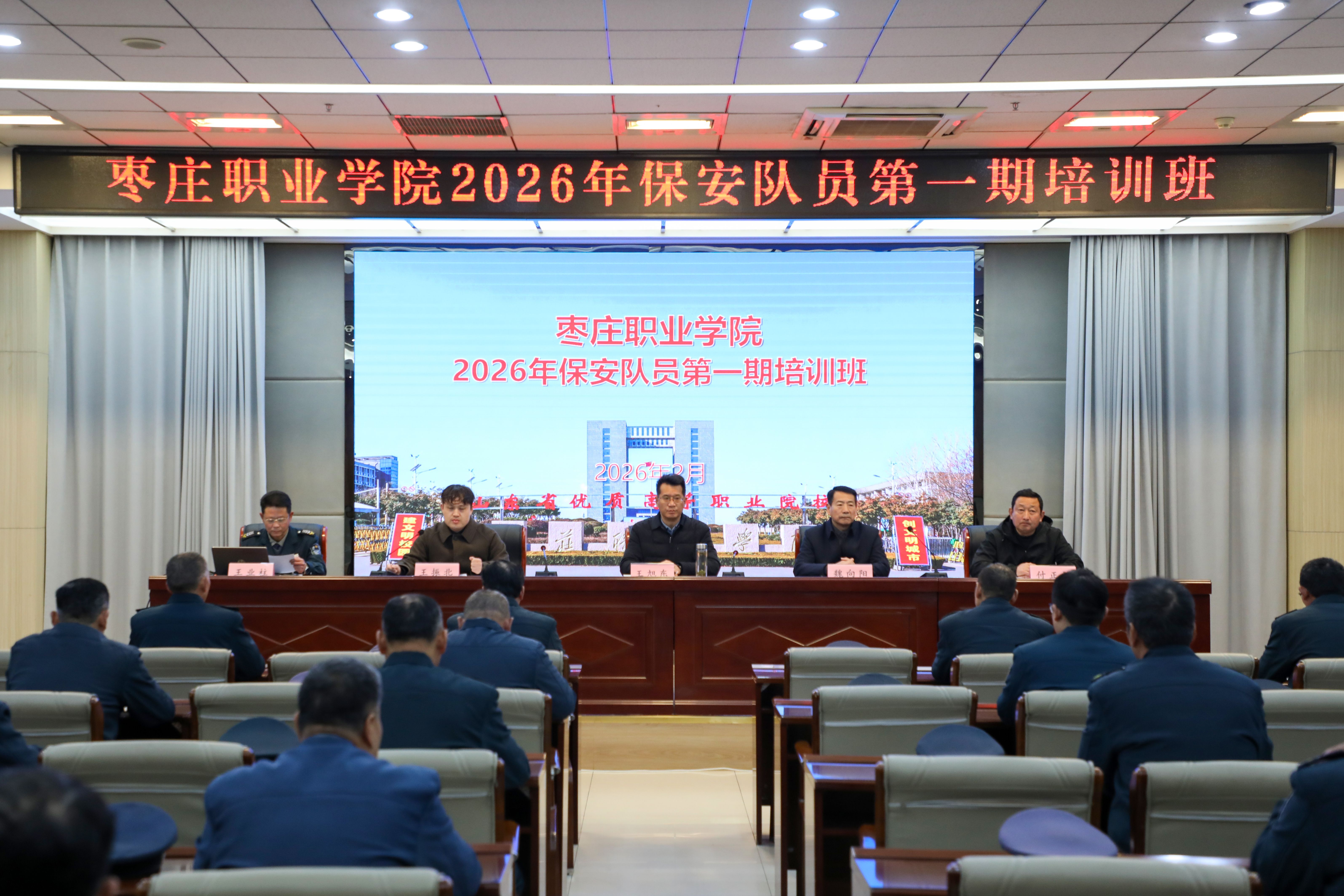 为全面提升校园保安队伍专业素养、纪律作风与应急处突能力,切实筑牢校园安全第一道防线,强化校园安全保卫工作,2月24日,学院2026年第一期保安队员培训班开班仪式在学术报告厅顺利举行。学院安全管理人员、枣庄市国安保安服务有限责任公司和保安队员等40余人参加了培训班。