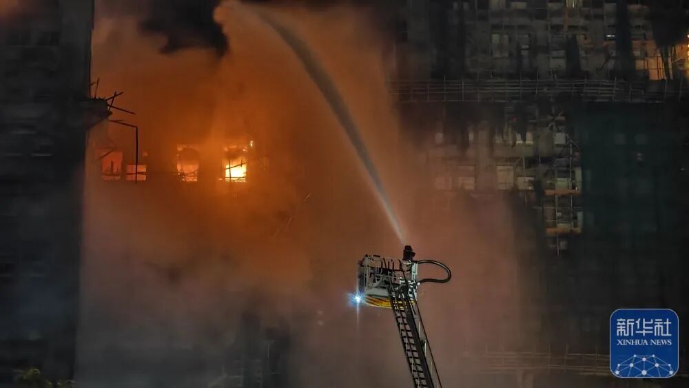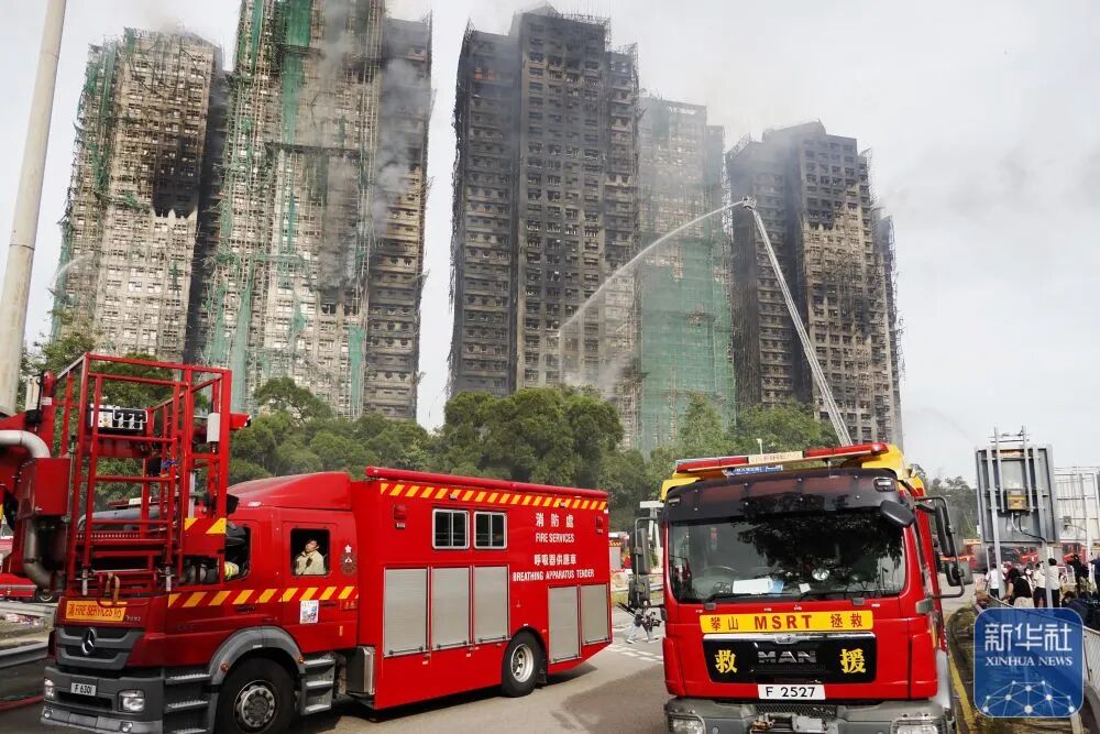 11月27日拍摄的香港新界大埔区宏福苑火灾救援现场。图源:新华社 王申 摄