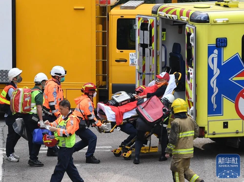 11月27日,救援人员从香港新界大埔区宏福苑火灾现场运出伤者。图源:新华社 陈铎 摄