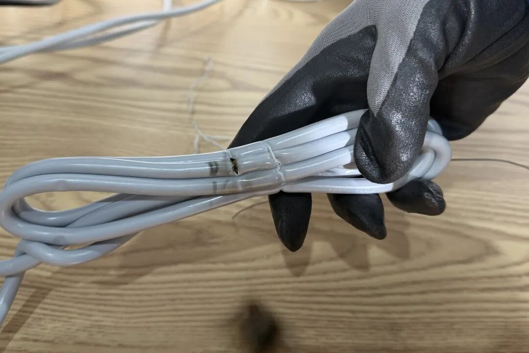 被捆扎的电线外皮已烧焦。图源:南京消防